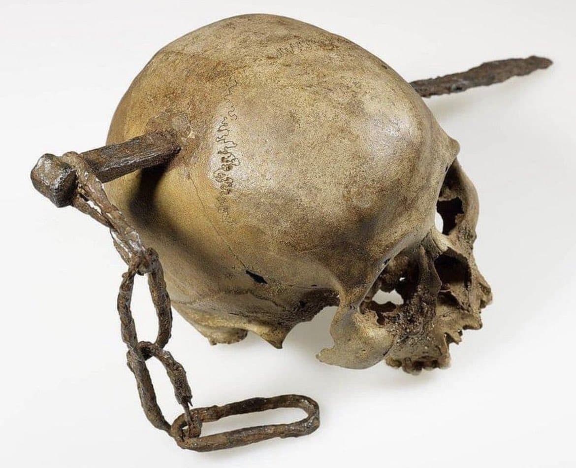 A Roman era skull found impaled with a large spike. It is currently on display in Bonn, Germany.
