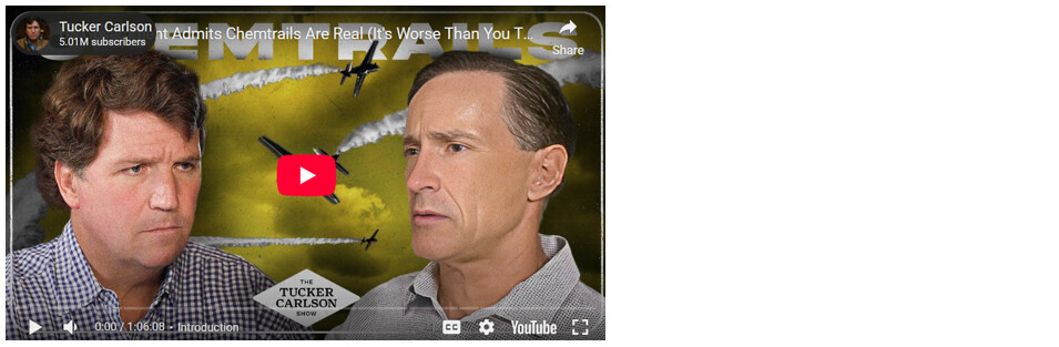 After 27-plus years of perpetual global geoengineering activity and its perpetual companion “conspiracy theory” rhetoric, I find the timing of Tucker’s enlightenment and the source (Dane) he selected to inform us all a bit disconcerting. It took Tucker and Team “six months” to find someone credible? (See 00:35 sec.) Really?