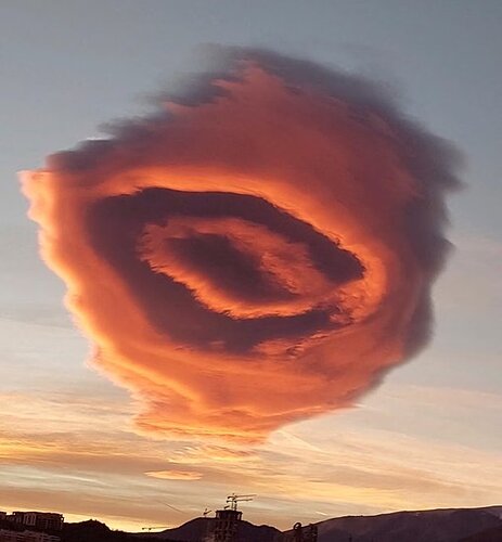 It can’t be confirmed to be exactly the same because the photographer is not underneath it. But it does look damn suspicious. Note the sky is clear all around the cloud, that is a lone cloud just like the one above, and to have that formation without a huge storm backing it up is damn suspicious. Earthquake prep? WEF style??