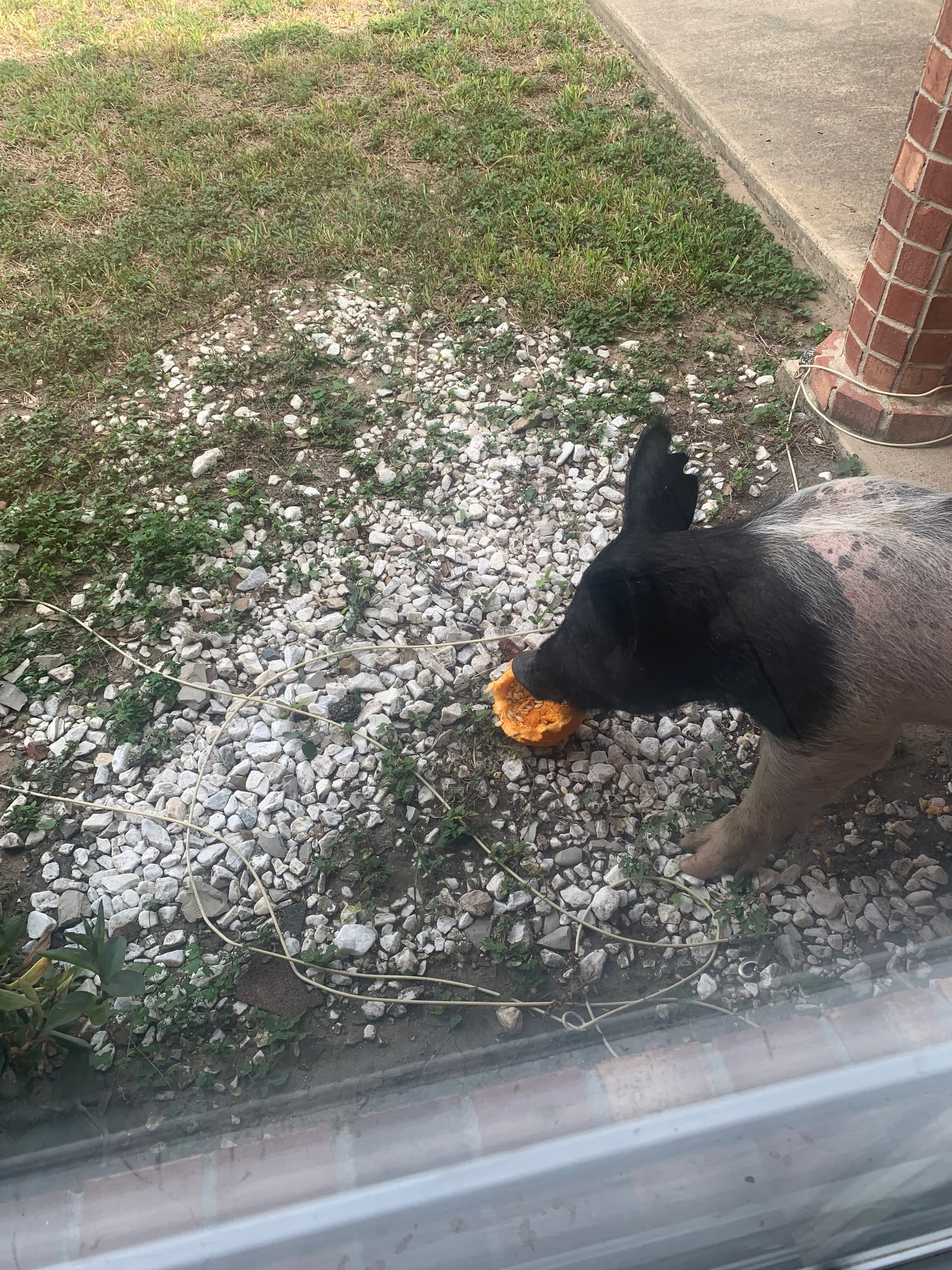 Evidently the owner was looking for him and found him eating the pumpkin in the front yard. He just kinda disappeared and didnāt finish eatingā¦The guy across the open field from the backyard fence raises a few hogs. I hear them every once in a while. Must have been one of his.