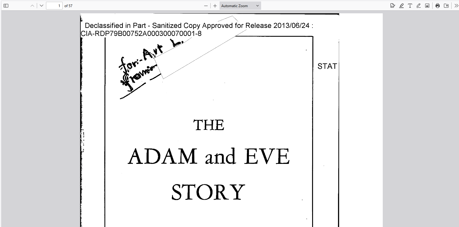 I have heard about the “Adam and Eve story” tied to the CIA on the conspiracy circuit a few times over the years, It refers to a semi-declassified copy of a book titled The Adam and Eve Story by Chan Thomas, which circulated in government archives and later drew attention when portions were released. I thought some people might find it interesting.