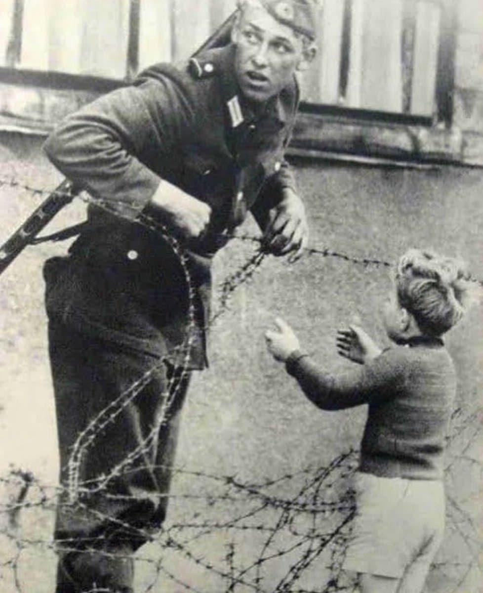 East German soldier helps a little boy sneak across the Berlin Wall the day it was erected in 1961. The boy had been left behind in the chaos of people fleeing to be with their families on either side of the wall.
