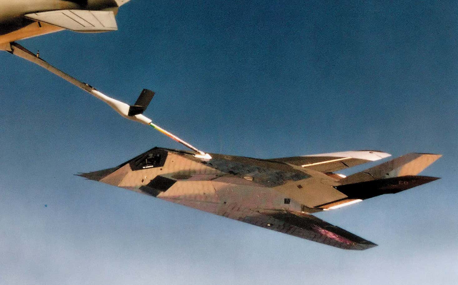 In its half-metallic scheme, the coated F-117 is refueled by a KC-135.