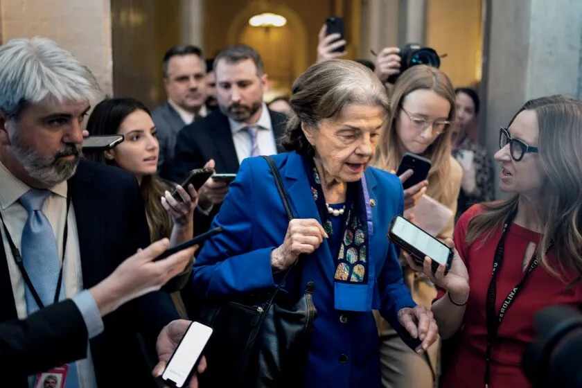 Sen. Dianne Feinstein (D-Calif.) speaks to reporters before entering the Senate Chamber on Feb. 14. Since being hospitalized with shingles in February, Feinstein has missed 58 floor votes. (Kent Nishimura / Los Angeles Times)