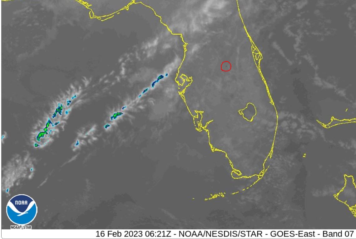 First discernable infrared (IR) dot first appears at 01:16 local time on NOAA website; image above is 01:21, circled in red. Also note the creepy bug-like clouds …I would wager they have something to do with the severity of the fire. They are not natural and always seem proximate to black-dot fires on the NOAA Image Viewer. Understand that each dot represents a 2km area; a fire needs to be REALLY hot for the darkest dots to appear.