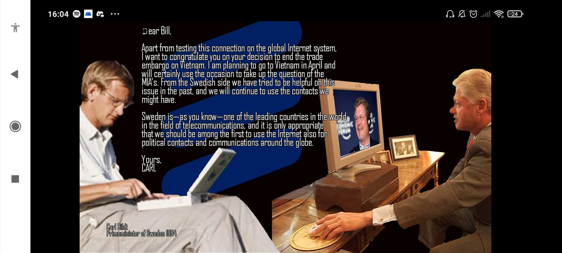 "On February 5, 1994, Sweden’s then Prime Minister Carl Bildt writes an email to US President Bill Clinton (and also receives a reply). It is the first time that heads of government have emailed each other