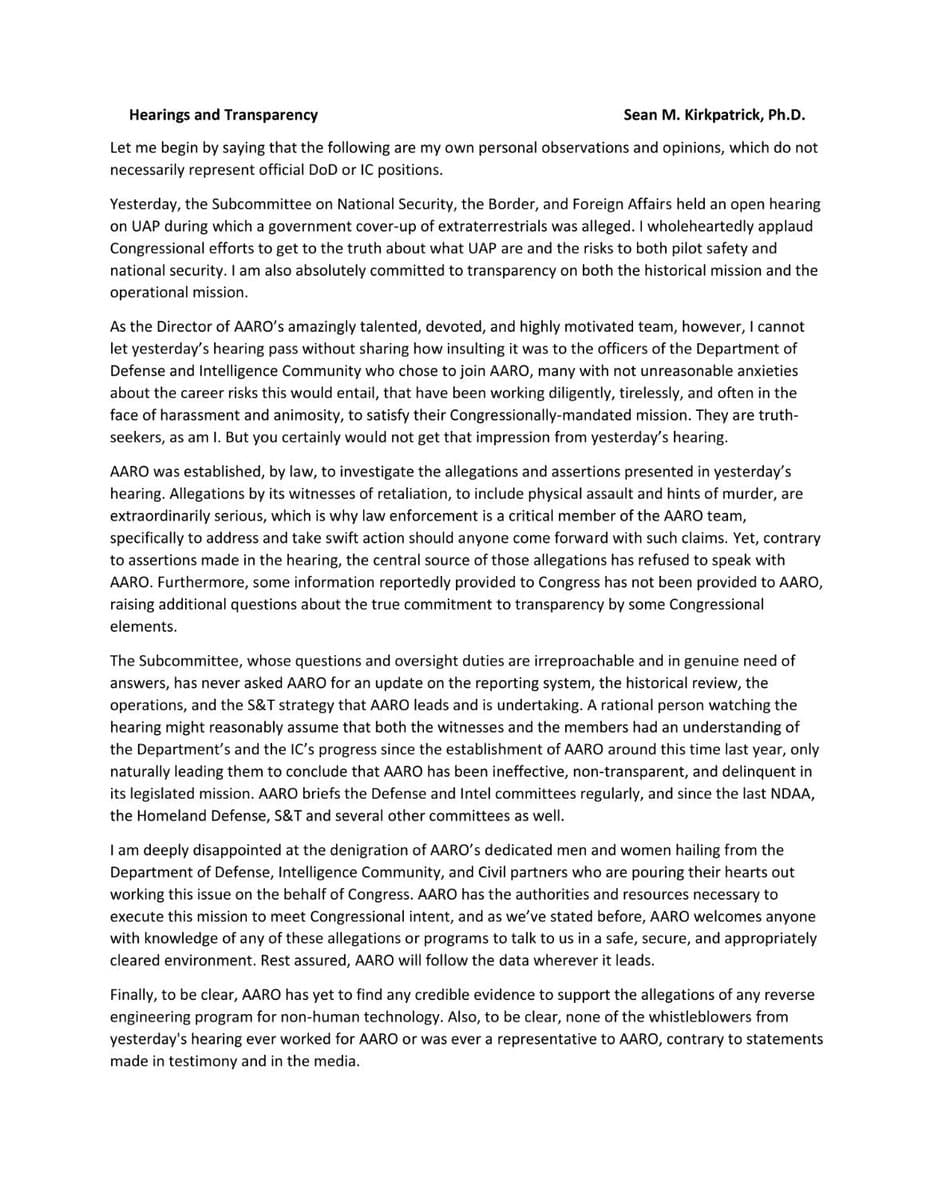 Folks, please read this statement from the director of AARO, Sean Kirkpatrick, and understand that the Pentagon is not happy about the Congressional hearing on UAP. There is obviously a factional war raging behind the scenes between those who want disclosure of the alien presence and those who do not. The psyop narrative is a low resolution analysis that does not account for the facts. Embrace the complexity of this historic moment.