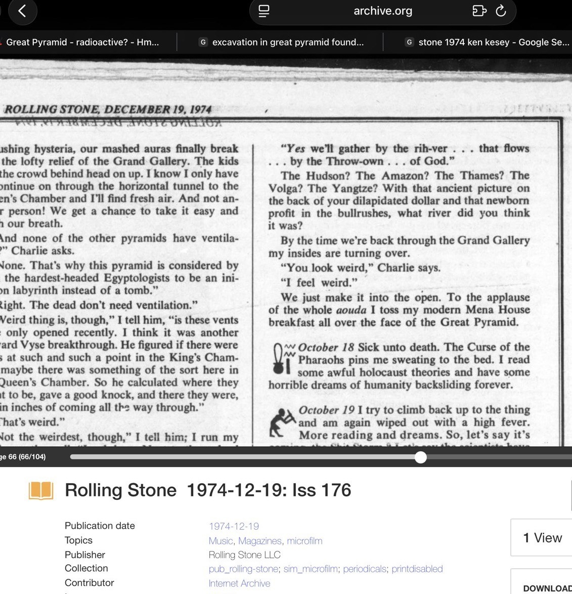 And …. Part of the 1974 Rolling Stone article by Ken Kesey describing his sudden illness in the King’s chamber of the Great Pyramid. Sourced from Internet Archive.