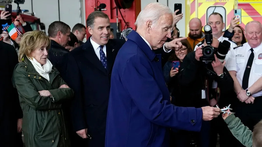 President Biden’s sister Valerie Biden Owens, left, and son Hunter Biden look on as a child hands President Biden a toy Air Force One as he greets people at Dublin International Airport in Dublin, Ireland, on Wednesday, April 12, 2023.