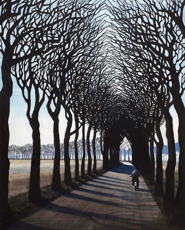 It’s by Clare Allan, the location is a tree lined road in Drenthe in the North of Holland… https://www.clareallanart.com/