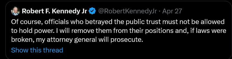 I understand the feeling, but if Kennedy said that now, he wouldn’t ever be listened to again. Already they are ramping up to savagely personally attack him, on everything from his voice to the color of his tie, to why did his 2nd wife take her own life? In addition, behind the scenes, his Children’s Health Defense is constantly taking legal action on many fronts, and working to educate the public. He has also given jobs to people like Michael Kane, NYC teacher of many year’s service, who lost his job over refusing the jab. Michael is doing a lot in NY state, working for teachers, firefighters, etc. CHD has expanded to Europe - CAF has been involved w them there - & I think recently the UK.