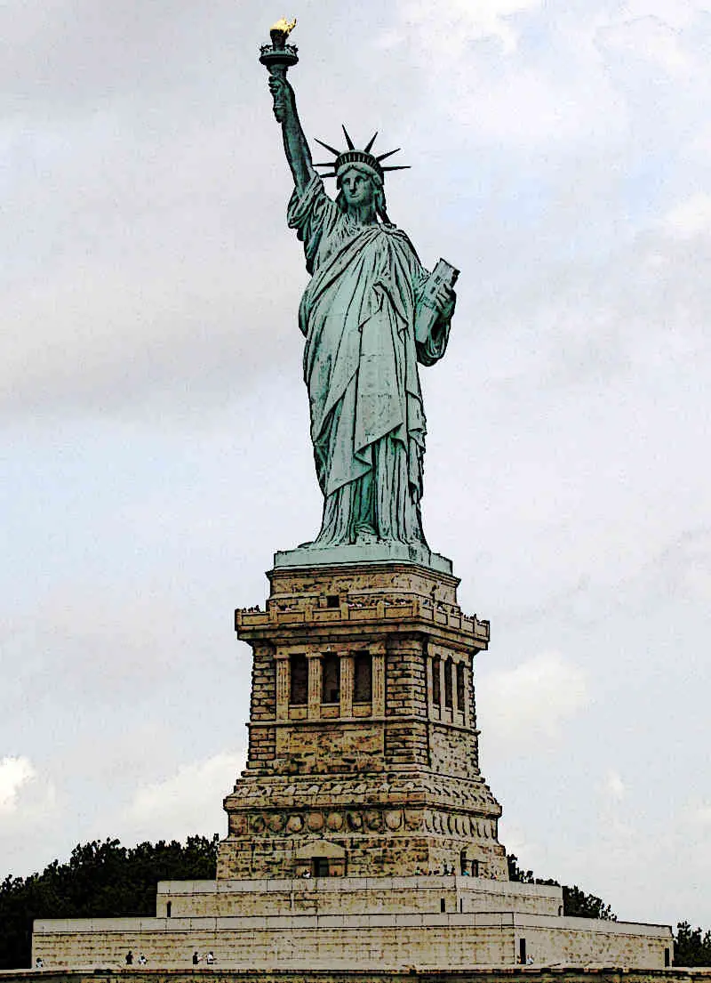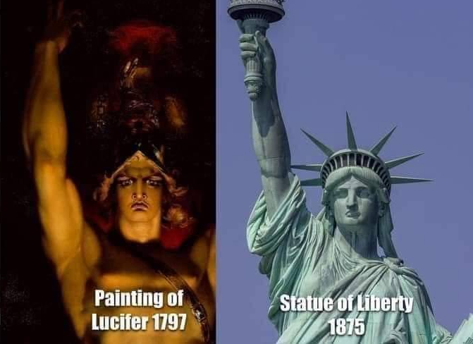 There are a lot of major differences between this painting and the statue of liberty, but they both have at least one arm raised, so that is why they are being compared?