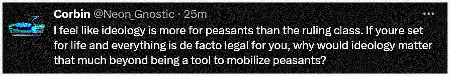 For some in the ruling class, Iām sure thatās true. However, for others ā arguably, some of the most dangerous to the peasants ā I think itās decidedly not true.