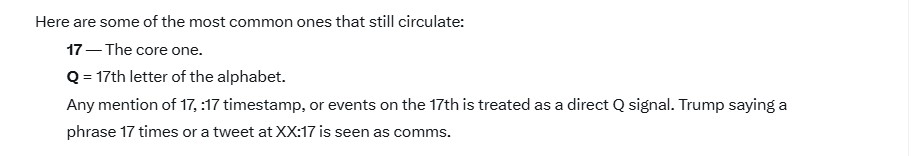 In addition to the Q posts, which still spring up periodically, there are cues (Q’s?) that are posted in numbers as GEMATRIA. Anons, or people who followed that stream, frequently develop lists of possible interpretations of these numbers or number combinations.