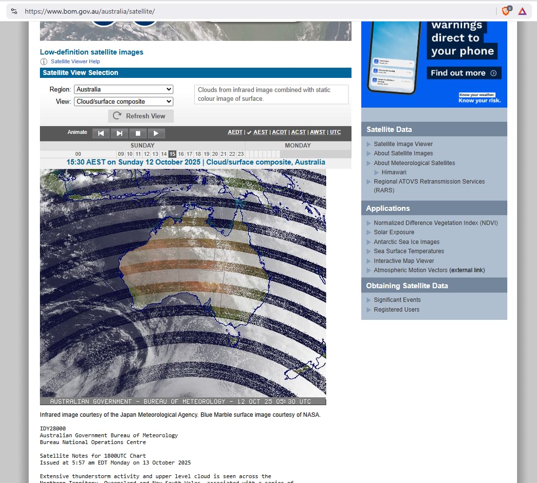 High-definition satellite images scroll through to 5.30am Oct 12th 2025 sequence. Similar weirdness reported back in June also.