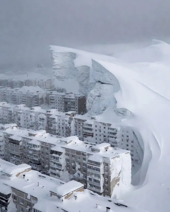 aerial photo of apartment buildings in Russia’s Kamchatka Peninsula nearly buried by record January 2026 snowfall, with drifts over 2 meters deep marking the heaviest in 60 years, as confirmed by Reuters and ABC News reports on the “snow apocalypse” that disrupted transport and daily life.