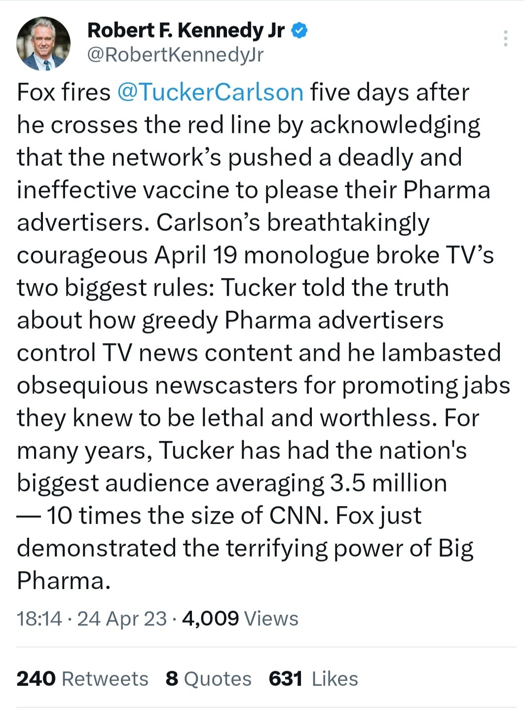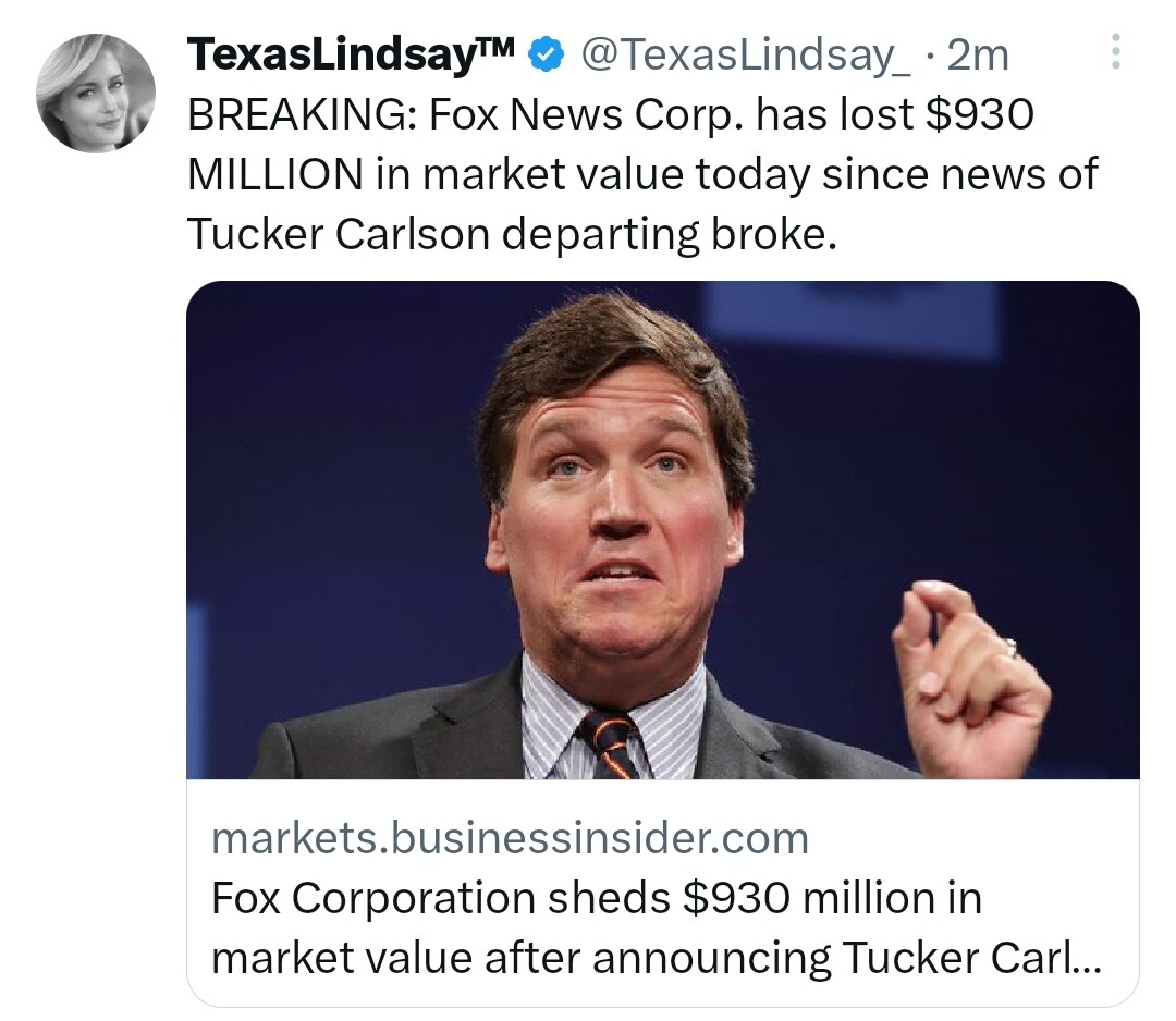 Scenarios on Tucker future run rampant on twitter right now. Anything from moving to twitter tv, to running as a VP on a ticket with Trump or Kennedy.