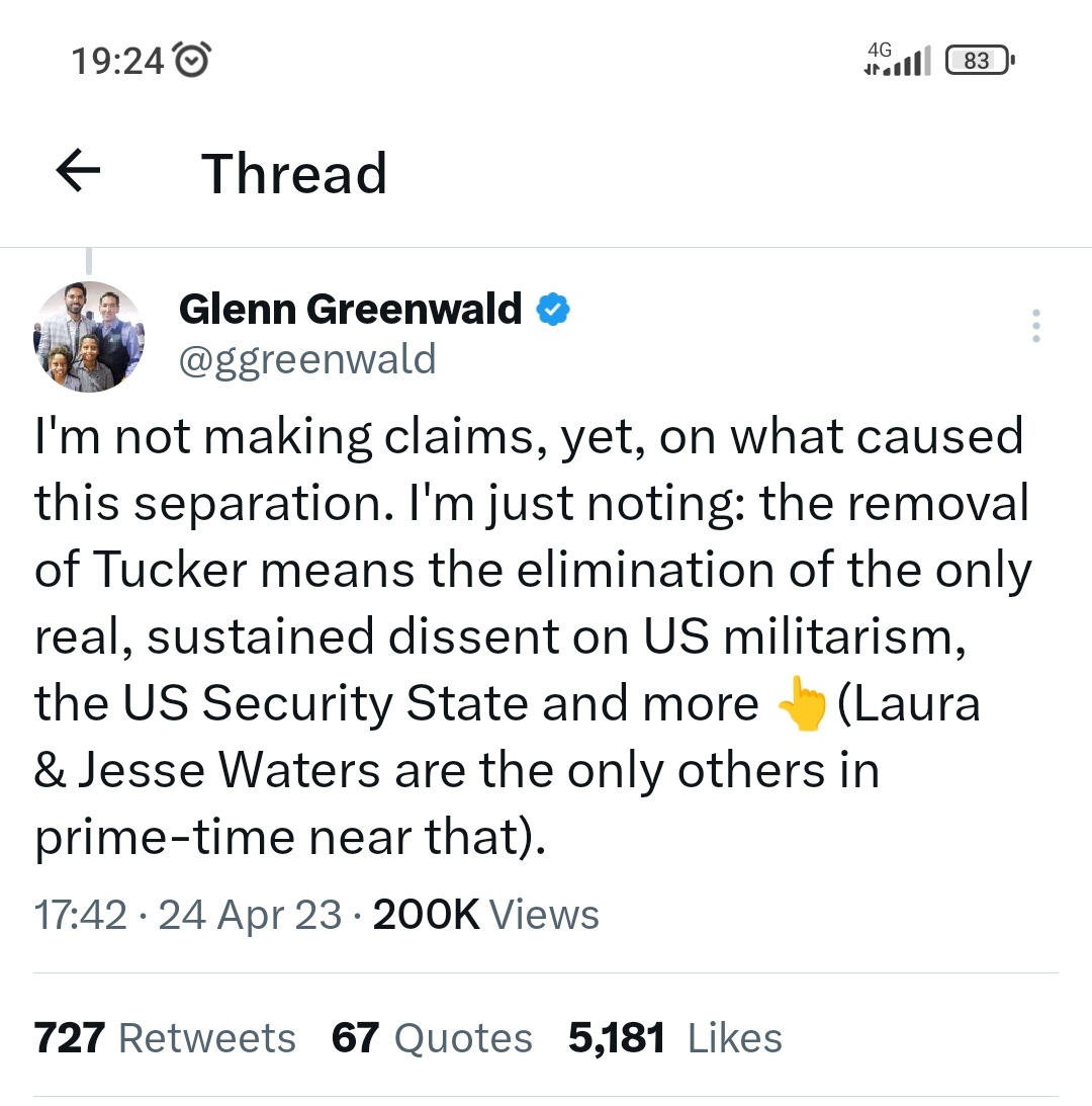 See I don’t view this as a surprise to Tucker himself. He knew for a while and probably made the decision to leave long time ago. If one analyses his shows for last year or two, they become more emboldened and truthful. Finally, the fruit was ripe enough to drop.