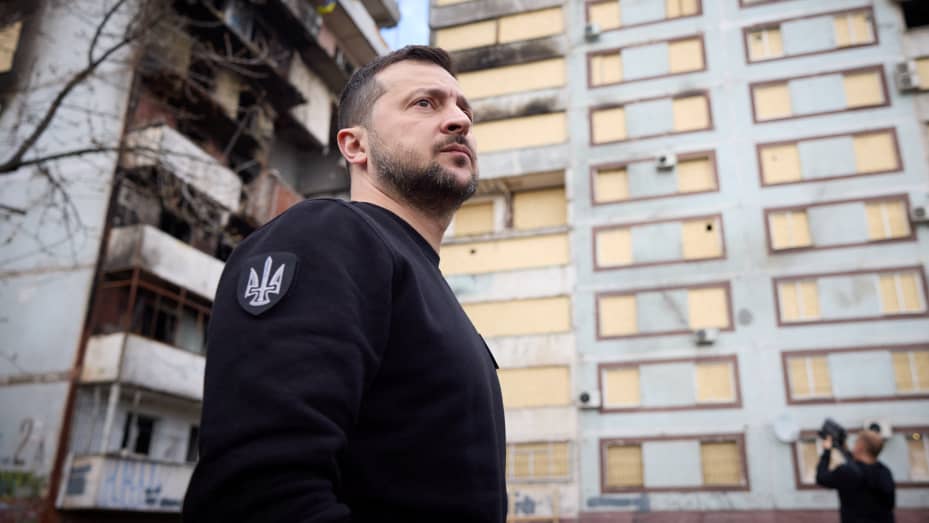 Ukraine’s President Volodymyr Zelenskyy visits a site of residential buildings recently damaged by a Russian missile strike, amid Russia’s attack on Ukraine, in Zaporizhzhia, Ukraine March 27, 2023.