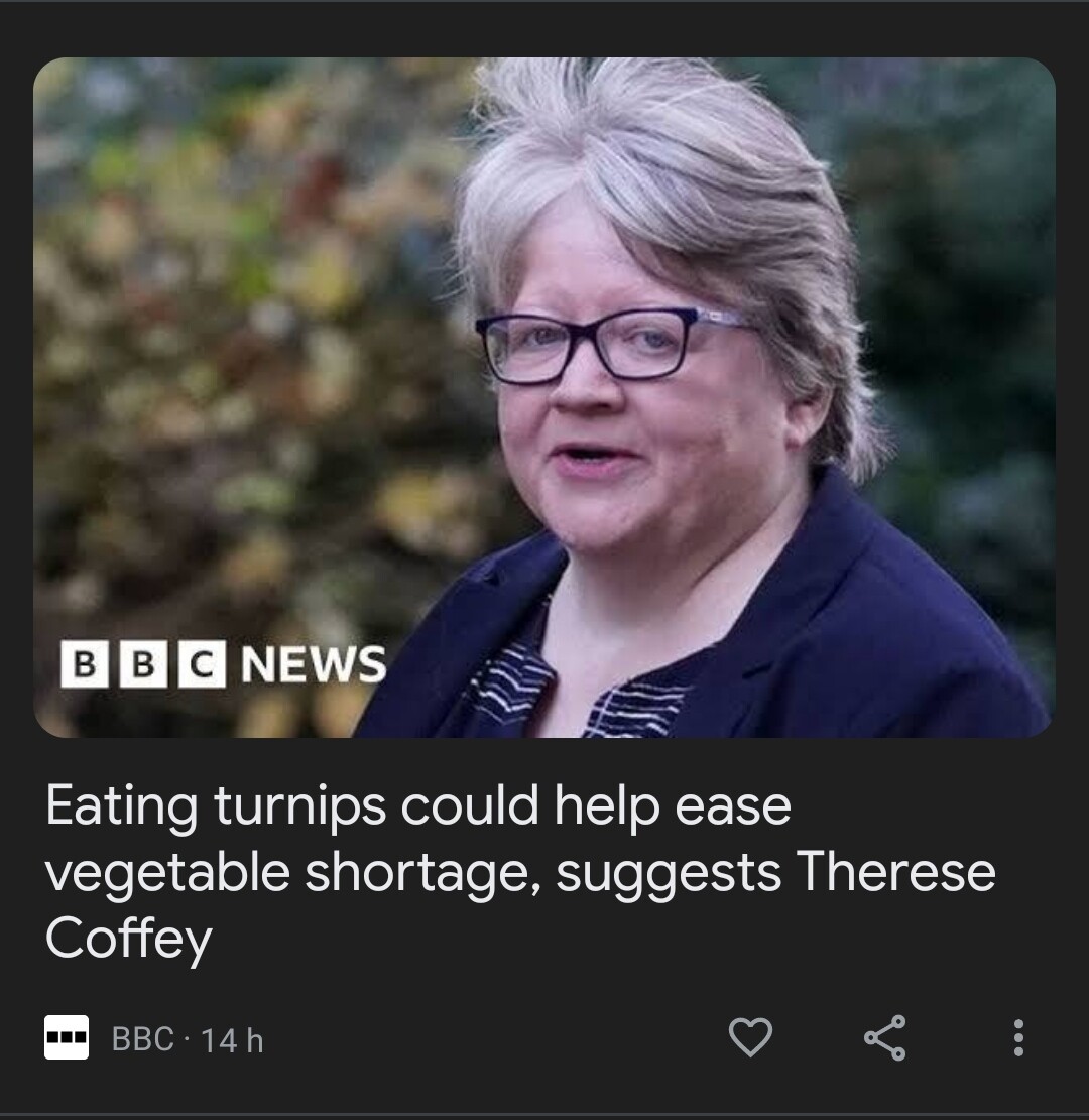 [Re: the BBC headline and photo] Wow, that is rich! I haven’t had such a good laugh in a long time!! There’s one consolation, I suppose: at least it’s turnips, not bugs. (Do we think Therese Coffey knows what a turnip – or a vegetable – is??)